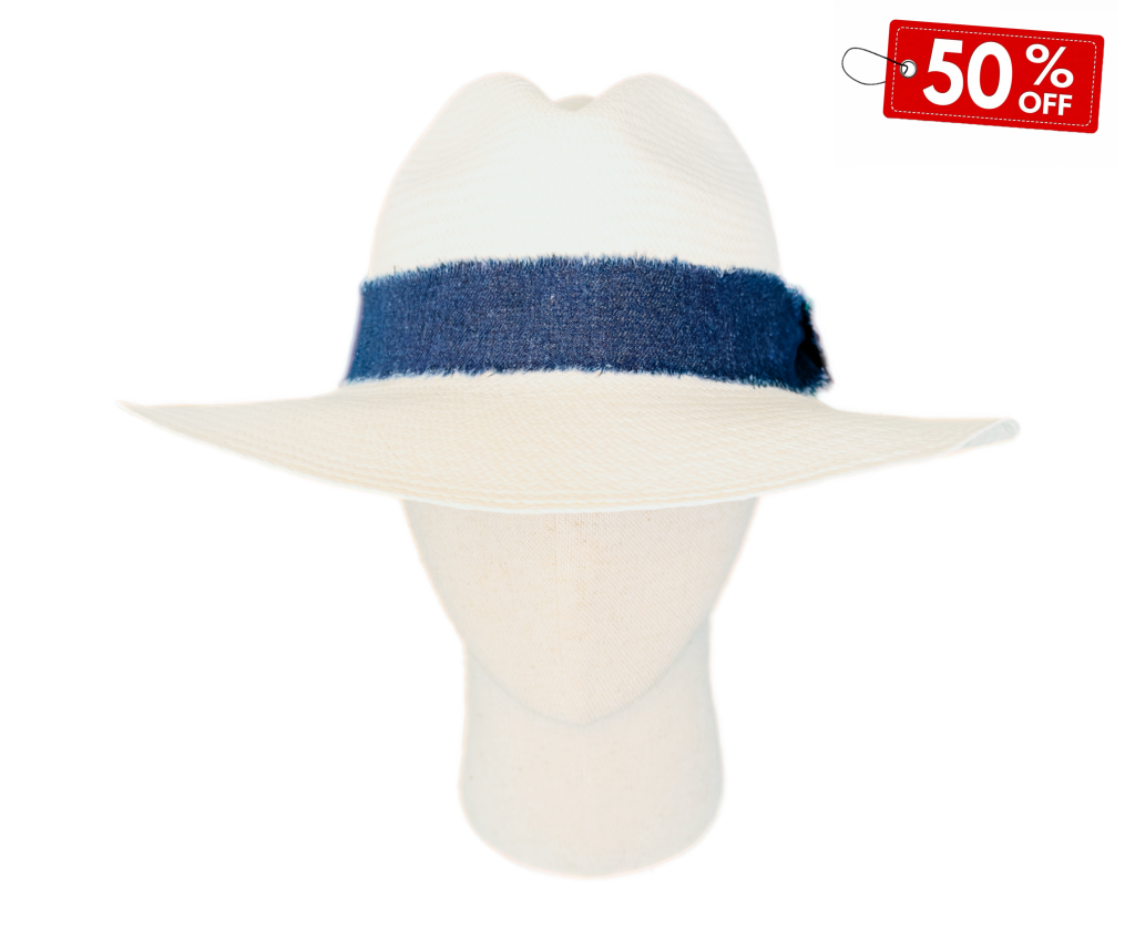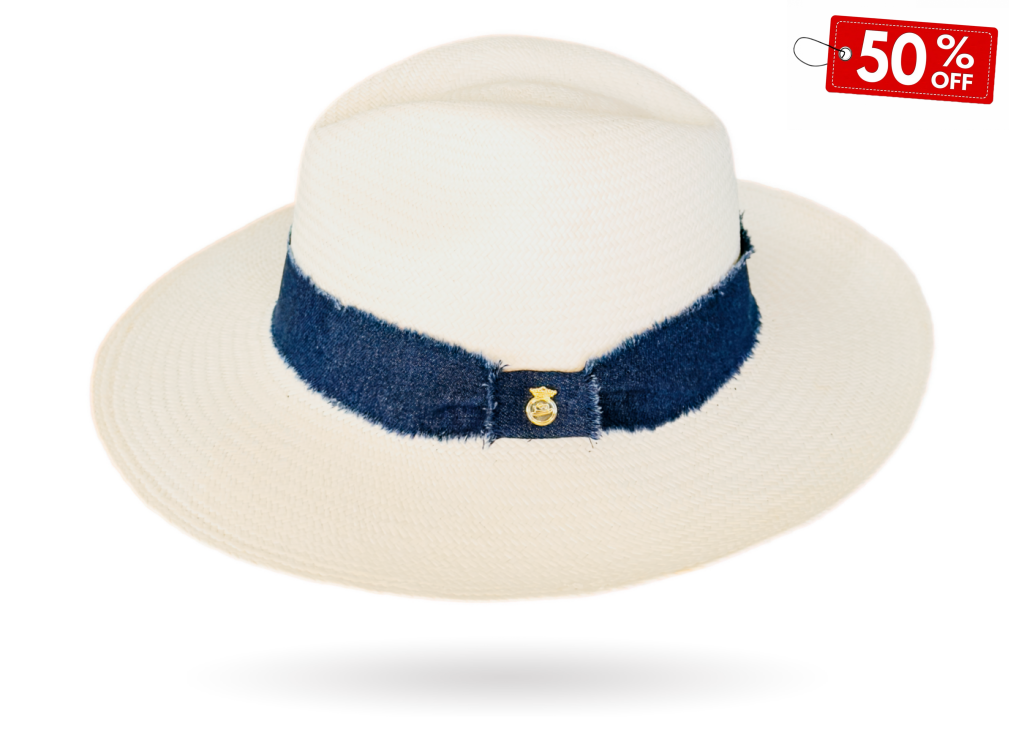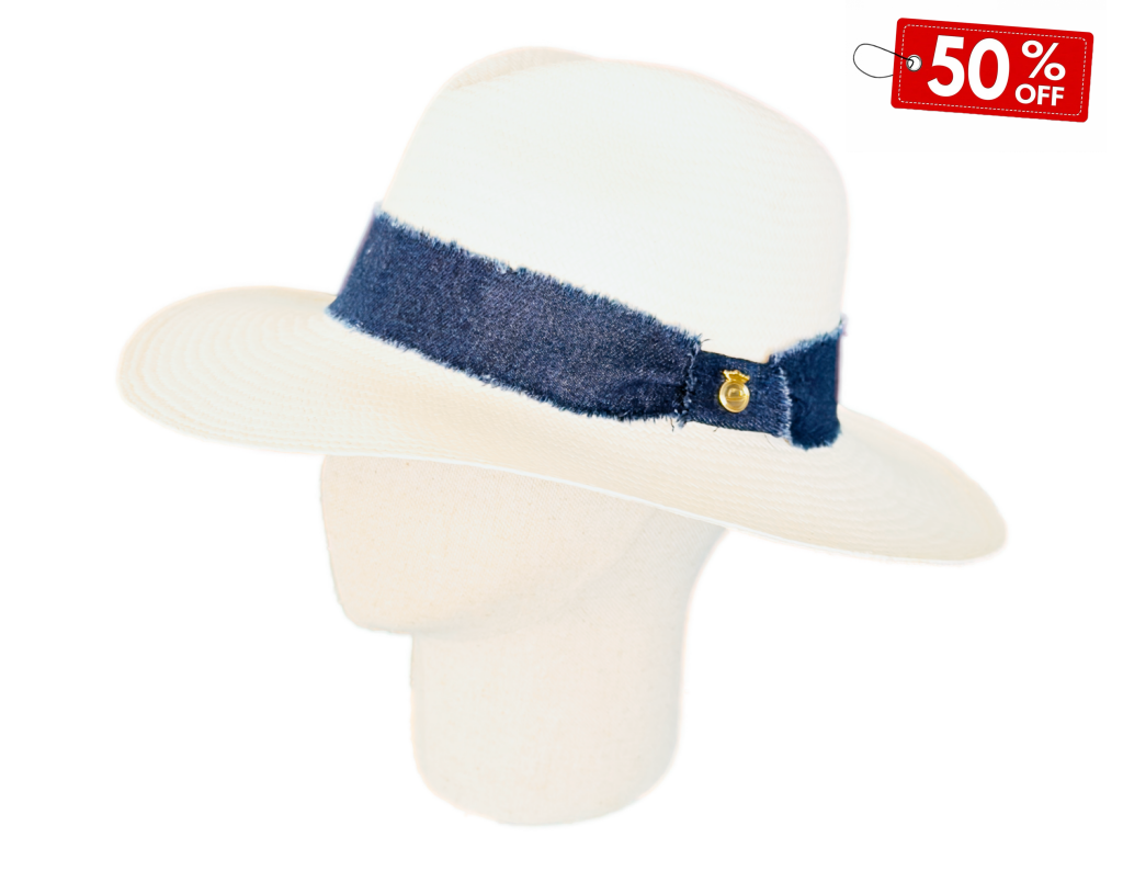 Hatband: Denim fringed band with our iconic golden pin fixed on the side that adds distinction to any summer outfit