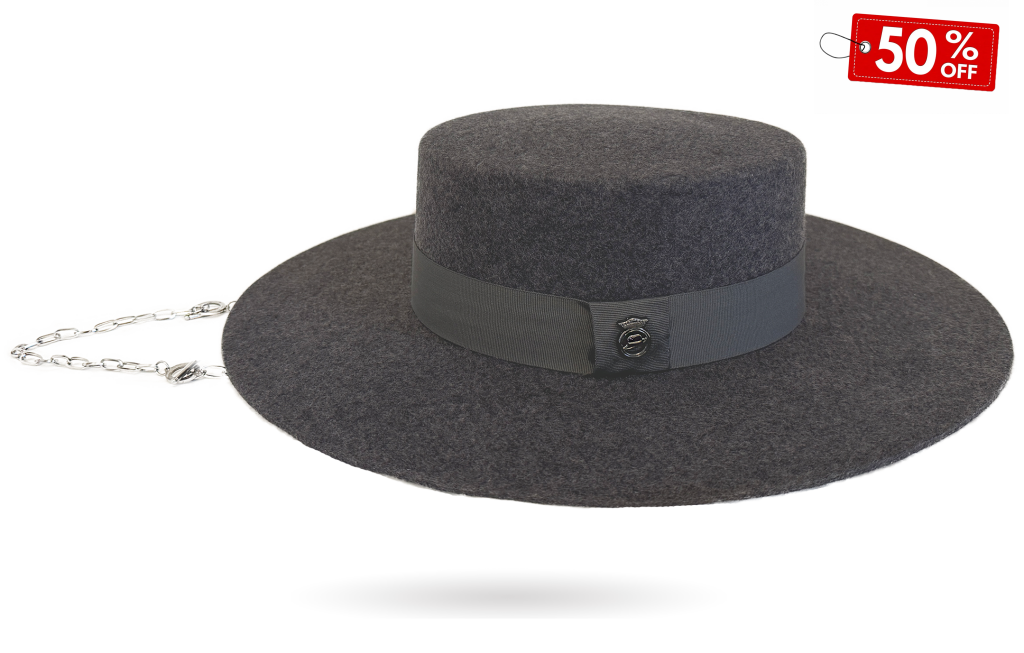 Hatband: Graphite grey grosgrain ribbon with our iconic metallic logo embellished with luxury silver chains