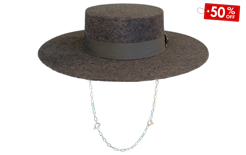 MOTTLED GRAPHITE WOOL FELT HAT ‘CORDOBES’ 9CM WIDE BRIM WITH SILVER CHAIN